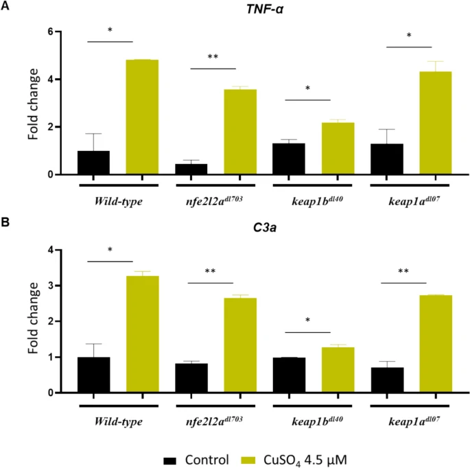 Fig. 5 Dysregulated inflammatory gene expression in keap1b mutants. Relative mRNA expression of A TNF-α and B c3a in larvae after 12-h exposure to a sub-lethal concentration of 4.5 μM CuSO4 (to analyze the transcriptional inflammatory response prior to the onset of significant mortality). The lethal phenotype of keap1b−/− larvae observed at higher concentrations (Fig. 4B) is associated with a significantly blunted transcriptional induction of these key pro-inflammatory cytokines compared to wild-type, suggesting that the hypersensitivity is due to an inadequate, rather than excessive, inflammatory response. This indicates that Keap1b plays a critical role in facilitating proper inflammatory gene expression through an Nrf2-mediated response mechanism. Expression is normalized to ef1a and relative to the untreated WT group. Data are mean ± SEM (n = 3). *p < 0.05