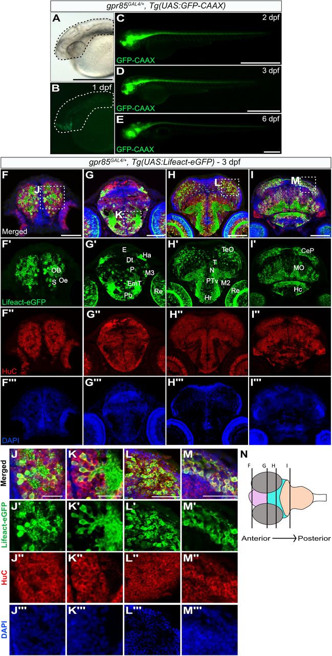 Fig. 1 Gpr85 is broadly expressed by maturing neurons in the zebrafish brain parenchyma during late embryogenesis. A–E, Lateral views of live gpr85GAL4/+, Tg(UAS:GFP-CAAX) zebrafish embryos at 1 dpf with bright-field (A) and fluorescence imaging (B–E) showing the GFP-CAAX signal in the brain and spinal cord at 1 dpf (B), 2 dpf (C), 3 dpf (D), and 6 dpf (E). (N = 3) Scale bars, 50 μm. F–I, Maximum projection confocal images of coronal sections of the brain from a 3 dpf gpr85GAL4/+, Tg(UAS:Lifeact-eGFP) zebrafish larva stained with anti-GFP (green; F′–I′), anti-HuC (red; (F″–I″) and DAPI (blue; F″′–I″′). Lifeact-eGFP+ cells are observed in the OB, subpallium (F′), Ha, retina, eminentia thalami, preoptic region, pallium (G′), tectum opticum, hypothalamus (H′), cerebellar plate, and MO (I′). Boxed regions are enlarged in panels J to M. Scale bars, 50 µm. J–M, Enlarged optical sections of the areas boxed in panels (F–I), showing Lifeact-eGFP+/HuC+ neurons in the brain parenchyma. (N = 3) Scale bars, 25 µm. N, Schematic representation of the coronal sections of the brain illustrated in F–I, with the forebrain in pink, the midbrain in turquoise, and the hindbrain in peach. CeP, cerebellar plate; DT, dorsal thalamus; EmT, eminentia thalami; H, rostral hypothalamus; Ha, habenula; Hc, caudal hypothalamus; MO, medulla oblongata; N, region of the nucleus of medial longitudinal fascicle; M2, migrated posterior tubercular area; M3, migrated area of EmT; OB, olfactory bulb; Oe, olfactory epithelium; P, pallium, Po, preoptic region; PTv, ventral part of posterior tuberculum; Re, retina; S, subpallium; TeO, tectum opticum; T, midbrain tegmentum; dpf, days postfertilization.