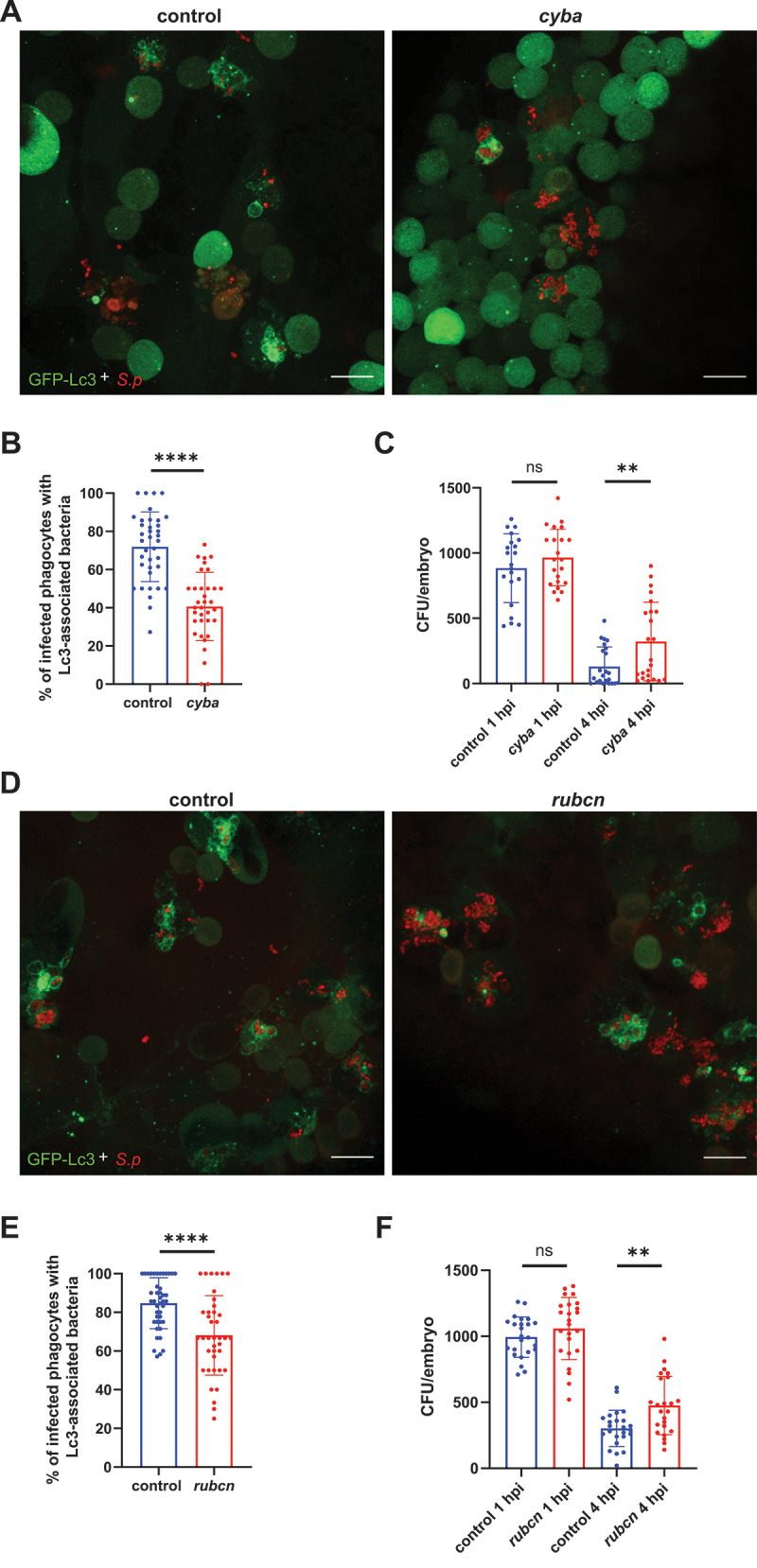ROS-dependent autophagic response contribute to clearance of S. pneumoniae. (A, D) Representative confocal images of control and indicated gene knockdown (A – cyba, D - rubcn) CMV:GFP-Lc3 larvae infected systemically with approximately 1600 CFU of mKate2-labeled D39 Δcps S. pneumoniae and fixed at 2 hpi. Scale bars: 10 µm. (B, E) Quantification of Lc3 associations with intracellular S. pneumoniae within infected phagocytes of fixed CMV:GFP-Lc3 control and indicated gene knockdown (B – cyba, E - rubcn) larvae at 2 hpi. Data are shown as mean ± standard deviation (SD). Data obtained from three independent experiments. (C, F) Numbers of viable colony forming units (CFUs) over time of control and indicated gene knockdown (C – cyba, F - rubcn). Data obtained from three independent experiments.