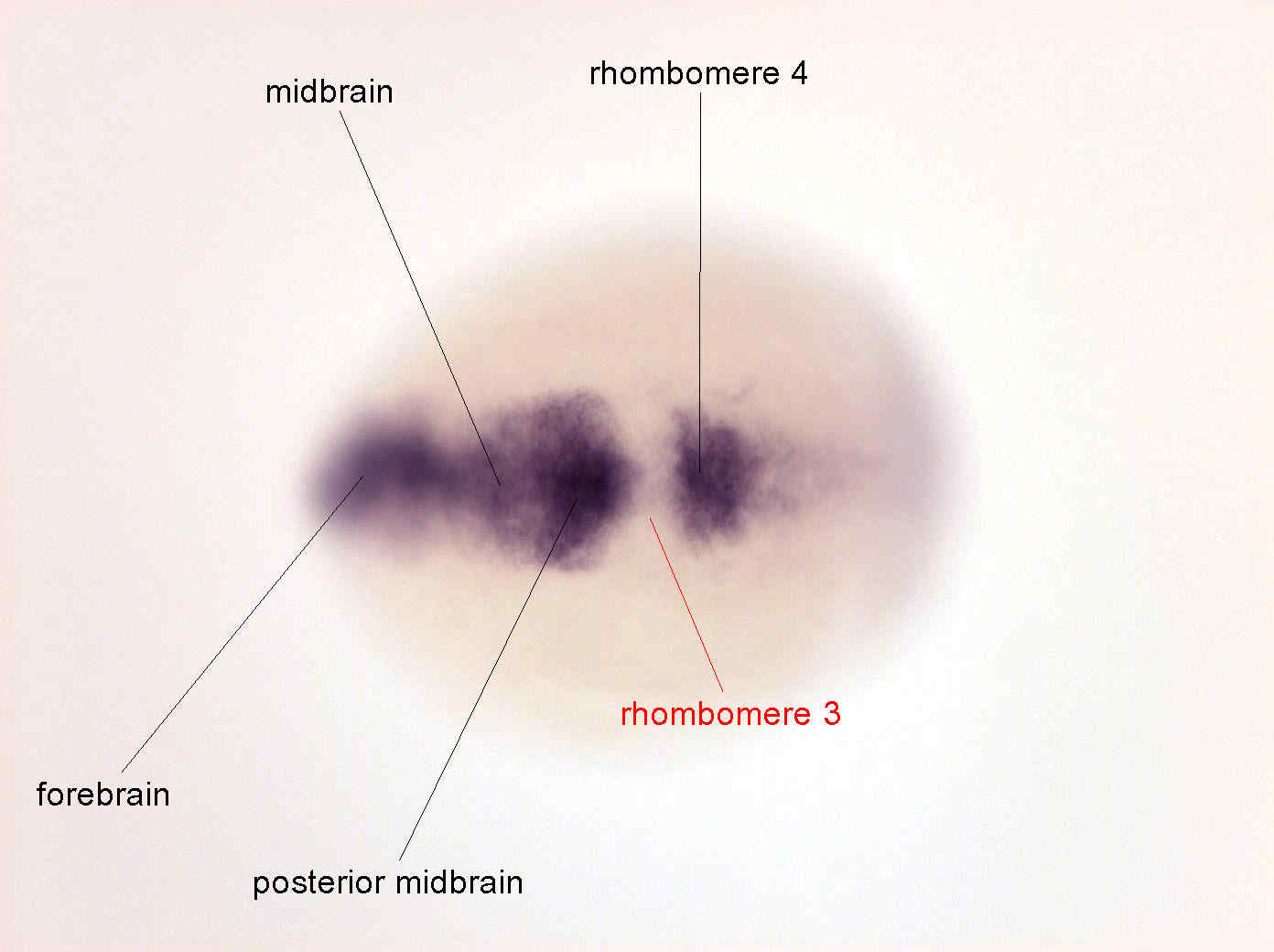 Fig. 2 double staining with Krox20 (not shown) identified the expression in the hindbrain at the level of the rhombomere 4