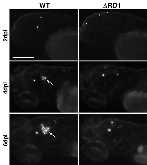 Overall progression of infection after hindbrain ventricle injection of 50-100 CFU of WT (left) or ΔRD1 (right) Mm. Though the burden of bacteria at 2dpi appears similar, the advent of a granuloma (arrows) in WT by 4dpi results in dramatically greater bacterial numbers by 6dpi. All bacteria present in these animals were only found in the head (data not shown), thus granuloma formation does not proceed from recruitment of infected cells. Scale bar, 200μm. |