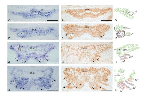 Expression pattern of E-cadherin in first-generation teeth. Left panels: mRNA expression; middle panels: protein expression; right panels: diagram of different cell layers of the tooth. A, B, C: Initiation phase. D, E, F: Morphogenesis phase; G, H, I: Early cytodifferentiation and attachment phase; J, K, L: Late cytodifferentiation phase and initiation of successor. ph.c.: pharyngeal cavity; ph.e.: pharyneal epithelium; *: dental papilla; arrowhead: enamel organ; block arrow: initiation replacement tooth. Diagrams: green cells: pharyngeal epithelium; red cells: outer dental epithelium; blue cells: inner dental epithelium. Scale bars = 2 5 μm. |