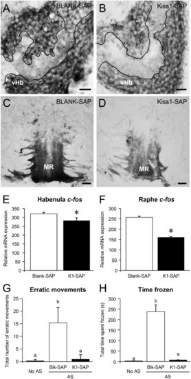 Effect of Kiss1-SAP on Kiss1 immunoreactivity 3-d after injection. (A–D) Transverse sections of Kiss1 immunoreactivity in the ventral habenula (vHb; A and B) and the median raphe (MR; C and D) in the brain of zebrafish injected with Blank-SAP (A and C) or Kiss1-SAP (B and D) at 3 d after injection (103 mol per fish, intracranial administration; n = 3 per group). (Scale bars, 10 µm.) Note that there was no effect of Kiss1-SAP on Kiss1-immunoreactivity compared with in Blank-SAP treated fish at 3-d after injection, which could be due to a time course effect. Therefore, we decided to observe the effect of Kiss1-SAP at 12-d after injection (Fig. 6). |