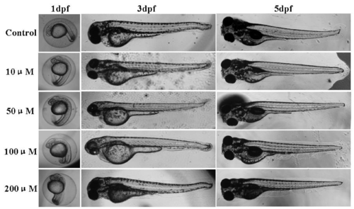 Effects of micrometam C on morphological changes of zebrafish embryo. Representative photographs of the morphological changes of the embryos treated with different concentrations of the micrometam C were taken. Experiments were performed in triplicate Morphological changes are not different among different groups. |