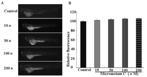 Effect of micrometam C on cell death in zebrafish embryo. (A) The cell death was measured after acridine orange staining by image analysis and fluorescence microscope; (B) The cell death was quantified using an Image J program. Experiments were performed in triplicate and the data are expressed as mean ± SEM. Cell deaths are not significantly different among different groups. |