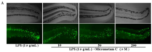 Effect of micrometam C in inflammation-induced zebrafish model by tail-cutting. Experiments were performed in triplicate and the data are expressed as mean ± SEM. Fluorescent cells count are significantly different at p < 0.05 as analyzed by ANOVA. (* p < 0.01 vs. LPS). |