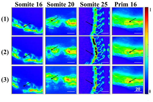 Typical confocal microscopic images (1) before and (2 and 3) after the ultrafast photo-induced disruption of the vascular structure in zebrafish embryos in four different developmental stages. The images were taken with a time lapse of 0.5 sec. The black arrows indicate the targeted area of the ultrafast laser beam. Scale bar: 20 μm. |