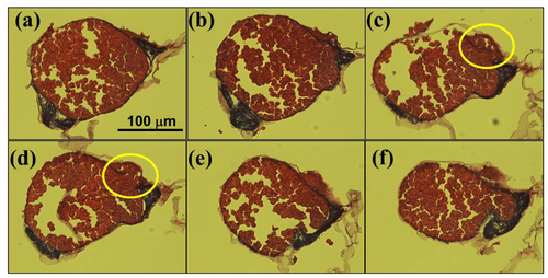 Series of optical images of the zebrafish embryo sections. The images from (a) to (f) were successively obtained from the samples sectioned by crytome with a thickness of 20 μm. Only the middle sections (c-d) exhibit complete disruption marked with yellow circles of the angiogenesis in addition to the feature of yolk cell extrusion. However, Figs. 3(a)-3(b) and 3(e)-3(f) reveal only the extruded yolk cells from the embryos and they maintain intact vascular structure parts at the border. Scale bar: 100 μm. |