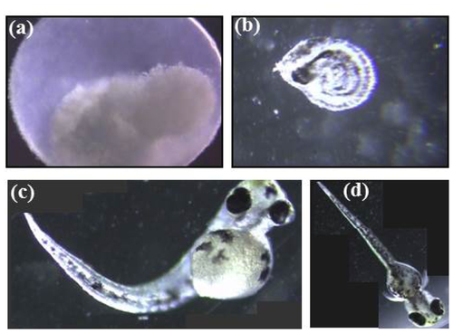 The typical final status for each development stage of the laser-treated zebrafish embryos. (a) embryo did not progress further in development after the laser irradiation; (b) embryo developed but did not hatch and eventually died; (c) embryo hatched but the juvenile fish did not have a good shape; and (d) embryo finished its developmental process, hatched well, and grew normally even though the embryo’s vascular structure was treated with an ultrafast laser. |