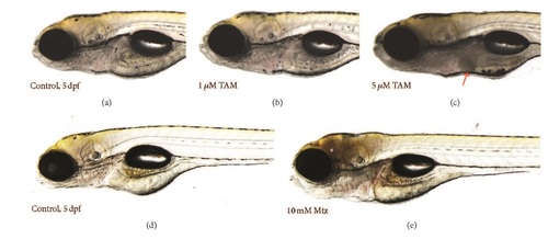 Tissue-specific cell death in the zebrafish larvae treated with tamoxifen (TAM) or metronidazole (Mtz). (a) 0.1% DMSO-treated control (5 dpf) and (b) 1 µM and (c) 5 µM TAM-treated zebrafish larvae. (d) 0.1% DMSO-treated control (2 dpf) and (e) 10 mM Mtz-treated zebrafish larvae. Liver-specific cell death was visualized by reduction of transparency in the TAM-treated zebrafish larvae (red arrow), compared to brain-specific cell death in the Mtz-treated larvae (white asterisk). For Mtz experiments, the transgenic zebrafish system, having neuron-specific nitroreductase expression, was used [20]. |