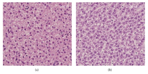 Histopathology of the adult liver treated with 0.5 µM tamoxifen for 24 hours. (a) Control untreated zebrafish liver and (b) 0.5 µM tamoxifen-treated zebrafish liver. Any significant cell death was not detectable in the 0.5 µM tamoxifen-treated adult liver, but vacuole formation was detected in hepatocytes. H&E staining. |