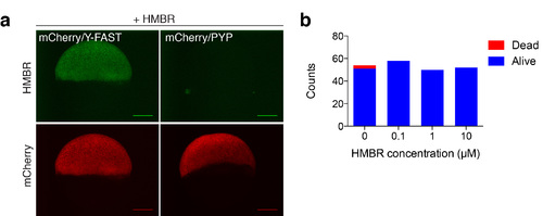 Labeling of fusion proteins in zebrafish. (a) Spinning-disk confocal micrographs of live zebrafish embryos co-expressing mCherry/Y-FAST or mCherry/PYP labeled with 5 μM HMBR during gastrulation (HMBR channel: Ex/Em 491/525-539 nm, mCherry channel: Ex/Em 561/605-664 nm; scale bars 200 μm). Side-by-side images were recorded using the same settings. (b) Viability of zebrafish embryos incubated with HMBR during development from 50 % epiboly to 24 hpf (19 hours of incubation). The plot shows for various HMBR concentrations the number of embryos that were alive with no morphological defect (blue) or dead (red) at 24 hpf. |