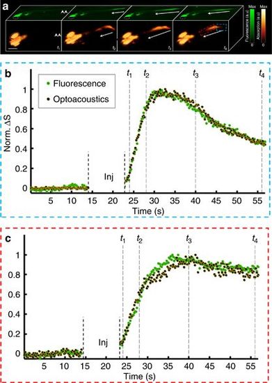 Imaging of neuronal activation in HuC:GCAMP5g zebrafish larvae. (a) Planar epifluorescence (green) and 3D optoacoustic (absorption contrast, orange) images of a 6-day-old larvae at four time points after injection of neurostimulant show a similar dynamics of the signals (scale bar=500 μm). The arrows show direction of the activation as it progresses from the posterior (site of injection marked by a double arrow in the left frame) to the anterior part of the tail. Eyes are marked with a dotted line. (b) Traces of the fluorescence and optoacoustic signals recorded at 25 frames per second show calcium dynamics in the posterior region of the spinal cord (marked by red rectangle in a). (c) Corresponding traces in the anterior region (marked by the blue rectangle). The time points shown in a are marked by vertical dotted lines. Since both the background fluorescence and optoacoustic signals were close or below the noise level, the changes in the signals (ΔS) were normalized to unity instead of being divided by the respective resting signals. The injection phase caused image artifacts and is therefore excluded from the graphs. |