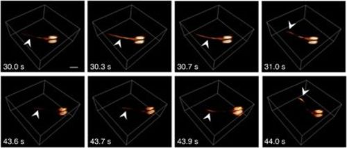 Activation in freely swimming larvae. Two separate activation events, as captured by volumetric optoacoustic tomography, are shown. Following injection of the neurostimulating agent at approximately t=0, the larva occasionally stops swimming while experiencing a surge of activation through its tail (the arrows point to the location of optoacoustic signal increase) before it starts moving promptly to a new position (notice movement of the tail in the two rightmost frames). Scale bar=500 μm. |