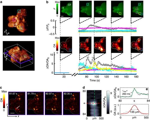 Monitoring activity in isolated scattering adult brains. (a) Typical 3D optoacoustic image acquired from a highly scattering brain of an adult fish in its resting state (two side views and one isometric view of the 3D reconstruction are shown). The telencephalon (T) and most of the optic tectum (OT) are clearly visible. Five 0.3 × 0.3 × 0.3 mm3 VOIs were chosen at different locations and depths within the brain. (b) Traces of the fluorescence (top) and optoacoustic (bottom) signal changes recorded at 25 frames per second are shown for the five regions in corresponding colors (all signal changes are normalized to the resting signal levels). Note that the optoacoustic traces are calculated over volumes, whereas the fluorescent signals are calculated over the roughly corresponding planar areas. Snapshot images (not normalized) acquired at five different time points before and after introduction of the neurostimulant are further shown (scale bar=500 μm). The volumetric optoacoustic images are shown here as maximum intensity projections along the z axis. The injection phase caused image artifacts and is therefore excluded from the graphs. (c) Time-resolved images from a single (unaveraged) slice through the 3D optoacoustic data. Approximate location of the slice is indicated by a blue frame in a. (d) Close-up spatiotemporal resolution analysis of a single line (orientation of the line is shown by an arrow in c). (e) Temporal and spatial profiles through the image in d, revealing characteristic optoacoustic signal constants of 260 ms and 135 μm, respectively. Solid green and red lines correspond to fits through the individual data points. |