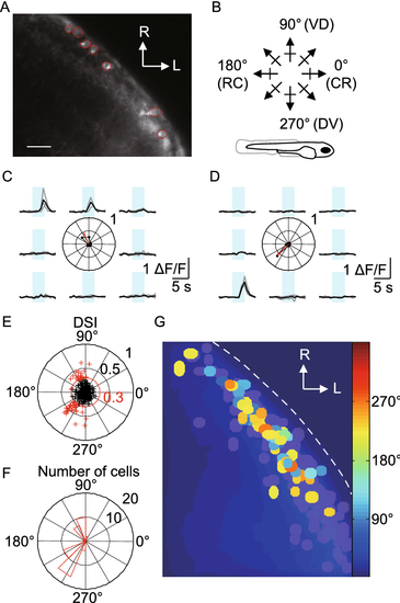Direction selectivity of SINs. (A) Fluorescent signal in Gal4s1156t, UAS:GCaMP-HS larva. Region of interests (ROIs) are demarcated by red lines. (B) Schematic showing direction of motion of bars relative to fish body axis (Bottom). VD: ventral to dorsal. DV: dorsal to ventral. (C and D) Ca2+ transients from two somata. Center: polar plot of normalized peak amplitudes of Ca2+ transients. Arrow shows vector sum of normalized peak amplitudes, indicating PD and DSI. (E) DSI and PD for all somata. Red circle marks a DSI of 0.3, used as criterion for DS. (F) Histogram of PDs for all DS cells from (E) in red. (G) All responsive somata from grouped experiments, color-coded according to PD. Gray somata showing responsive but not DS cells (total number of cells imaged: 304; responsive cells: 247, 81.3%). Scale bar, 20 μm |