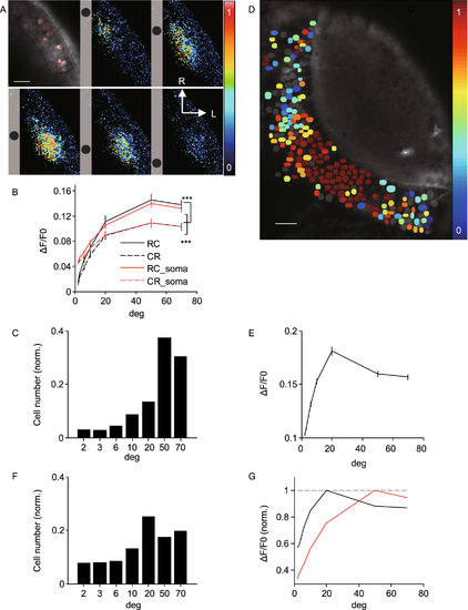 Size tuning of SINs. (A) Montage showing responses of SINs to moving dot stimulus of 10°, color-coded according to normalized responses. Relative position in each panel indicates direction of motion. Top left, fluorescence image showing analyzed ROIs demarcated by lines (population in black; somata in red). (B) Summary of responses to moving dots from population (n = 47 fishes, P = 2.3 × 10−10, two-way ANOVA) and responsive somata (n = 254/338, P = 1.8 × 10−9, two-way ANOVA). (C) Size preference distribution for all somata (n = 254/338 cells from 47 fishes). (D) Responses of PVNs to moving dot stimulus of 20°, color-coded according to normalized responses. Gray somata showing nonresponsive cells. (E) Summary of responses to moving dots from all somata (n = 1,651). (F) Size preference distribution from all somata. (G) Comparison of tuning curves between SINs (red) and PVNs (black) |