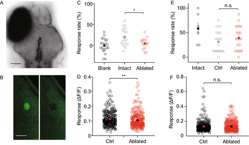 SINs are crucial for prey capture but not looming-evoked escape. (A) Confocal image of a 7 dpf larva with ipsilateral eye removed. Scale bar, 100 μm. (B) SIN before (Left panel) and after (Right panel) laser ablation. Soma is destroyed and cell debris is visible. Scale bar, 10 μm. (C) Prey capture reduced in SIN ablated larvae (n = 16) relative to control (n = 20, P = 0.0134, Student’s t-test). Blank indicates no fish control. (D) Prey-like moving dot stimulation (3°) evoked response in PVNs reduced in SIN ablated larvae (n = 348 from 13 larvae) relative to control (n = 362 from 15 larvae, P = 0.0011, Wilcoxon rank-sum test). (E) Looming evoked escape unaffected in SIN ablated larvae (n = 21) relative to control (n = 22, P = 0.3132, Wilcoxon rank-sum test). Intact fish serve as control. (F) Looming evoked tectal responses unaffected in SIN ablated larvae (n = 392 from 6 larvae) relative to control (n = 414 from 7 larvae, P = 0.9004, Wilcoxon rank-sum test) |