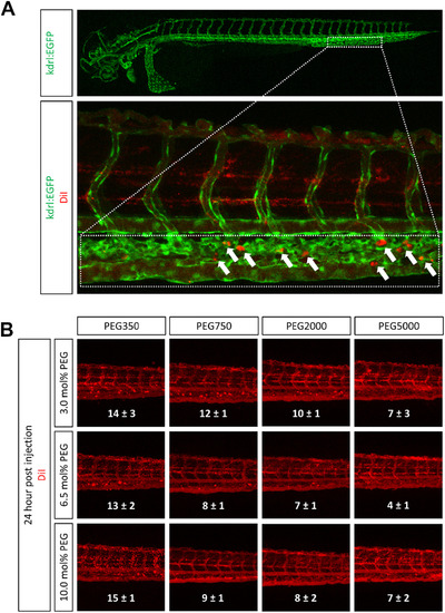 Influence of PEG modification on liposome accumulation in the zebrafish. DiI labeled Liposomes with various PEG molecular weights and PEG densities were injected into blood circulation of zebrafish 2 days post fertilization. (A) The indicated area (dotted box) of injected zebrafish representing part of the caudal vein and the caudal hematopoietic tissue was analyzed for liposome accumulates (white arrows) 24 h post injection. (B) Representative confocal images of the tail region for each liposome formulation are shown. The number of red dots (i.e. liposome accumulates) in the caudal vein was counted and is represented as mean ± SEM (n = 3). |