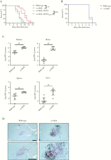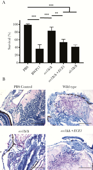 Candidalysin-induced immunopathology is required for virulence during hematogenously disseminated candidiasis. (A) Survival of immunocompetent mice after intravenous inoculation with 2 × 105 yeast phase cells of the indicated strains of |