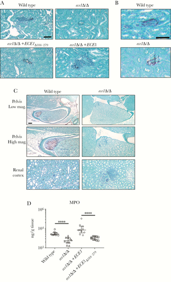Candidalysin is required for renal neutrophil recruitment and immunopathology. (A and B) Histopathology of the kidney of mice after 1 day of infection with 2 × 105 |