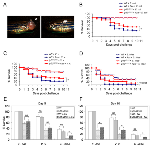 Prolonged survival to bacterial infection in azacitidine-treated zebrafish carrying the tp53M214K mutation. ( A) Micrographs of an over 8-month-old tp53M214K mutant zebrafish showing zMPNST in its right eye. The Kaplan–Meier survival curve of mock- or azacitidine (Aza)-pretreated WT or tp53M214K mutant zebrafish challenged with ( B) E. coli (107 CFU), ( C) V. vulnificus (105 CFU) or ( D) S. iniae (103 CFU), n = 30 for each group, analyzed by the Kaplan–Meier log rank test. The Day-5 ( E) and Day-10 ( F) survival rates are shown. Results are mean ± SD of three independent experiments. * p < 0.05, ns, not significant, by Student’s t test. |