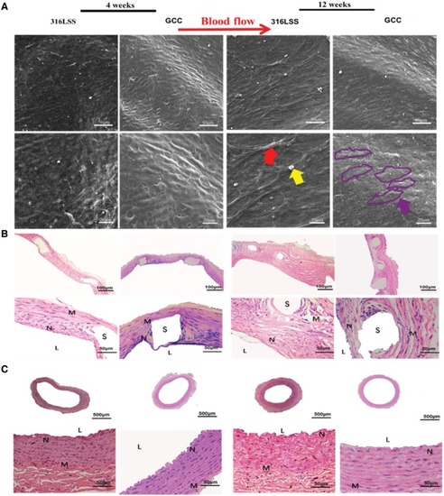 The GCC Stents have no significance effects on the main organs of rabbits at 4 and 12 weeks after implantation. The black arrows represent myocardial fiber, Central vein, Central arterial tube, alveoli and renal corpuscle |