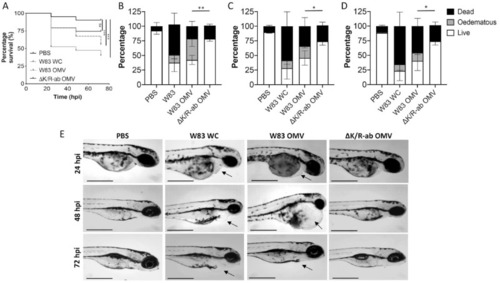 W83 outer membrane vesicles (OMVs) induce systemic disease in zebrafish larvae in a gingipain-dependent manner. ( |