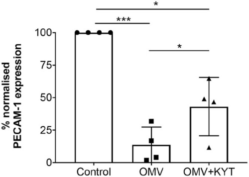 Inhibition of gingipain activity prevents ablation of PECAM-1 expression following W83 outer membrane vesicle (OMV) infection. W83 OMVs were treated with 2 µM KYT gingipain inhibitors for 1 h prior to human microvascular endothelial cell (HMEC-1) infection. HMEC-1 treated with W83 OMVs or untreated cells were used as controls. Flow cytometric analysis showed that the gingipain-specific inhibitor, KYT, prevented the loss of PECAM-1 cell surface abundance that was mediated by W83 OMVs. Data are mean ± SD normalized median fluorescence index (nMFI) from 4 independent experiments with statistical significance determined by a 1-way analysis of variance with Tukey’s post hoc multiple comparisons test. * |