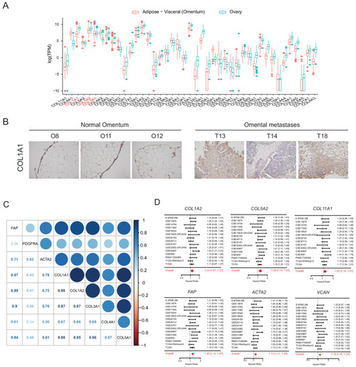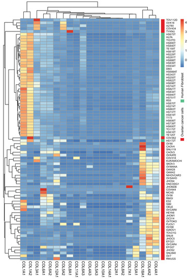 Unsupervised hierarchical cluster analysis and heat map visualization for expression of collagen-encoding genes among EOC cell lines (n = 47) and human fibroblast derived from various tissue origins (n = 37) using the CCLE dataset. |