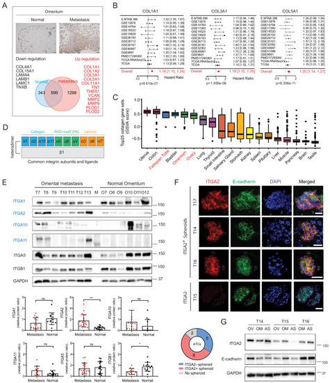 (A) Proteomic analysis identifies up- and downregulated ECM-associated proteins in omental metastasis versus normal omentum tissue (n = 8). Representative immunohistochemical staining of normal and metastatic omentum for COL1A1. Scale bar 50 μm. (B) Forest plots of the expression of collagens (COL1A1, COL3A1, and COL5A1) as univariate predictors of overall survival, using the curatedOvarianData (n = 2970) applicable expression and survival information. Hazard ratio (HR) significantly larger than one indicates positive correlation to poor outcome in EOC patients. (C) Box-whisker plots of top 25 collagens gene set variation analysis (GSVA) in 20 non-diseased tissues from GTEx RNA-seq dataset. (D) A schematic figure of integrin receptors and their corresponding ECM ligands. (E) Representative western blot shows the expression of collagen-binding integrins α1, α2, α10, α11, as well as integrin α5 and β1 in omental metastasis and normal omentum. Bar charts with relative integrin expression as mean ± SD (**p<0.05, ***p<0.001; n = 13–19). (F) Representative immunofluorescence images with membranous E-cadherin (green) and ITGA2 (red) staining in ATCs. Pie chart summarizes percentage of ITGA2+ tumor spheroids from EOC patients (n = 15). Scale bar 50 μm. (G) Western blot analysis of ITGA2 and E-cadherin expression in matched EOC patient samples, ascites (AS), primary (OV) and omental metastasis (OM). |