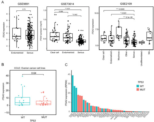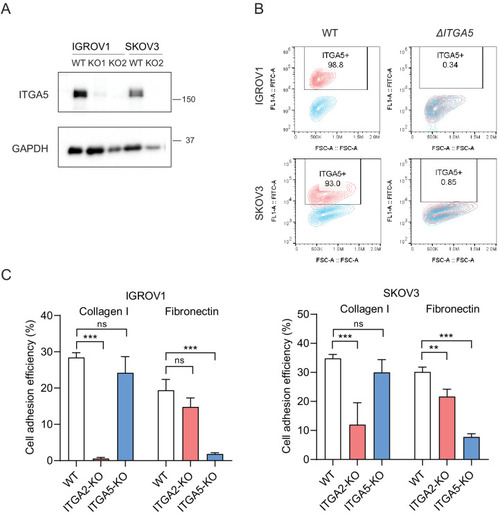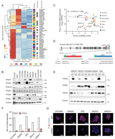 (A) Hierarchical cluster analysis and heat map visualization of known collagen-binding integrin-encoding genes among EOC cell lines using the Cancer Cell Line Encyclopedia (CCLE). The original histological subtypes and TP53 genomic mutation status were annotated as previously described (Domcke et al., 2013). (B) Representative western blot showing expression of collagen-binding integrins among eleven EOC cell lines. (C) ITGA2 expression (Spearman correlation R = −0.0012, p=0.99) is independent of histological subtypes and previously described serous suitability scores (Domcke et al., 2013). Representative EOC cell lines used in this study are annotated. (D) CRISPR-Cas9 mediated deletion of ITGA2 targeting exon 29–30, resulting in a 743 and 747 bp genomic deletion. (E) Immunoblot confirms loss of ITGA2 expression in five of ΔITGA2 (KO) cell lines while the binding partner ITGB1 was not altered. (F) Bar chart showed the median fluorescence intensity of ITGA2 expression in WT and ΔITGA2 cells by flow cytometry. (G) Representative fluorescence images with membranous ITGA2 expression in WT and ΔITGA2 cancer spheroids collected from ultra-low attachment plate. Scale bar 100 μm. |