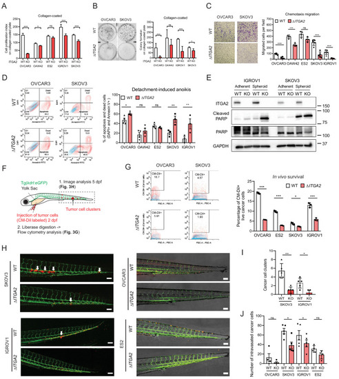 (A) Cell proliferation index of WT and ΔITGA2 cells in collagen-coated plate. (B) Anchorage-dependent colony formation assay for WT and ΔITGA2 cells on collagen-coated plate after 7 days incubation. Bar chart represents the mean ± SD of total colony counts. (C) Chemotaxis cell migration assay and quantification of cell migration (24 hr). Scale bar 200 μm. (D) Cell detachment-induced apoptosis (anoikis) assay. WT and ΔITGA2 cells stained with Annexin V-FITC and DAPI after 3–5 days of cultivation in ultra-low attachment plate to identify apoptotic dead cells (FITC+/DAPI+). Mean ± SD (*p<0.05) from two independent experiments. (E) Western blot shows increased cleaved PARP in the KO compared to WT cells under non-adherent spheroid condition. (F) Scheme of tumor cells transplant model in Tg(kdrl:eGFP) zebrafish. CM-Dil labeled cancer cells were transplanted into zebrafish at two dpf (days post fertilization). (G) At five dpf, fish were enzymatically dissociated to single cells and analyzed in vivo survival of cancer cells by flow cytometry. Representative counter plot shows the percentage of CM-Dil+ cancer cells. Bar chart summarizes data from n = 5 fish per group. (H) Representative confocal images of transplanted fish (n = 5 per group) showing the tumor cluster formation in proximity of the circulatory loop (white arrow) at five dpf. Scale bar 100 μm. (I) Numbers of cluster formation and (J) single cells in tail vein were counted and represented as mean ± SD (unpaired Student’s t-test, *p<0.05). |