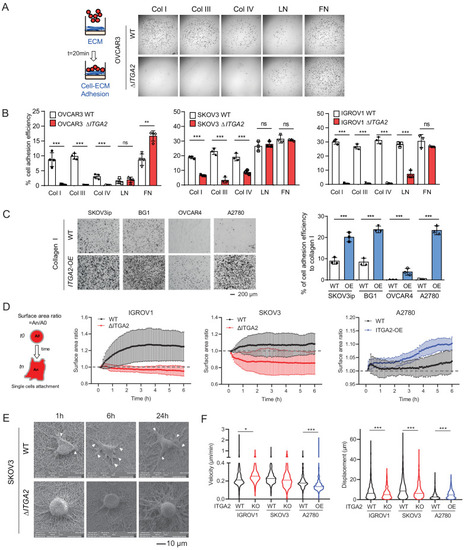 (A) Static cancer cell-ECM adhesion assay. Representative images showing OVCAR3 WT and ΔITGA2 cell adhesion to different ECM proteins, including collagen type I, III, IV, laminin, and fibronectin. (B) Bar charts with mean ± SD of the percentage of cell adhesion efficiency of OVCAR3, SKOV3, and IGORV1 cells from three independent experiments. (unpaired Student’s t-test, ***p<0.001) (C) Representative images and bar charts showing the cell adhesion to collagen I in four ITGA2-overexpressed EOC cell lines (unpaired Student’s t-test, ***p<0.001). Scale bar 200 μm. (D) Single cell adhesion on bioprinted collagen was monitored by time-lapse microscopy. Data represent the surface area ratio as mean ± SD (n > 300 single cells were analyzed per group). (E) Representative scanning electron microscope (SEM) images showing the SKOV3 WT and ΔITGA2 cellular adherence on bioprinted collagen at 1, 6, and 24 hr. White arrow indicates the polarized filopodia structure. Scale bar 10 μm. (F) Velocity and displacement of single cells on collagen-coated slides were measured (n > 300 per group from three independent experiments. Unpaired Student’s t-test, *p<0.05, ***p<0.001). |