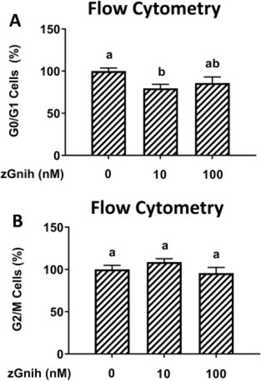 Fig. 1. (A–B) Concentration-related effects of zGnih (nM) on G0/G1 and G2/M cells. Following 7-days treatment ex vivo, zebrafish testes were dissociated and assayed for FACScan analysis by FCM. The percentage of diploid cells was determined by BD CellQuest Pro for 0, 10, 100 nM zGnih treatments (mean ± SEM; n = 5). Counts were normalized to 100%, and treatment groups were normalized against basal control (L-15 medium). Results were analyzed by ANOVA followed by Tukey's multiple comparison tests. values with dissimilar superscripts are significantly different (P ≤ 0.05).  |