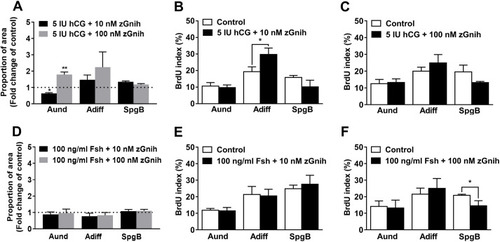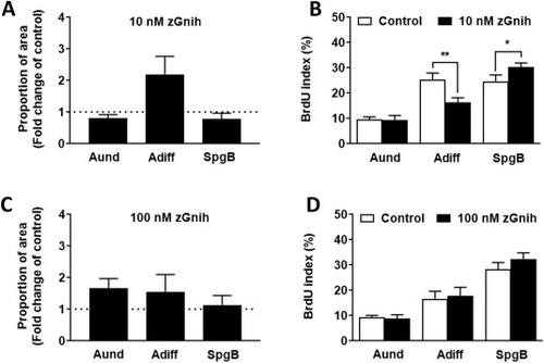 Fig. 2. A and D show the effects of zGnih on spermatogenesis after 7-days of zebrafish testis tissue culture. (A and C) Proportion of A undifferentiated spermatogonia (Aund), type A differentiated (Adiff) and type B spermatogonia (SpgB) were determined in the section surface area within the spermatogenic cysts in the absence (dotted line) or presence (black bars) of (A) 10 nM zGnih and (C) 100 nM zGnih. Results were analyzed by Student's T-test (n = 5) and presented as fold changes with respect to the control group (basal). Values are mean ± SEM, and sterisks represent significant difference from the basal shown as dotted line. B and D show incorporation of BrdU (5-Bromo-2′-Deoxyuridine) during the last 6 h of 7-days culture. BrdU labeling index of Aund, Adiff, and SpgB cells were determined in the cultured testes in the absence and presence of 10 and 100 nM zGnih. Bars show the mean ± SEM (n = 5). Each treatment was compared with its own (individual) control (contralateral testis). Asterisks over connected line denote statistical significance between the control and treatment group, using Student's T-test.  |