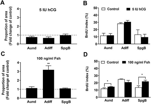 Fig. 4. A and D show the effects of 5 IU/ml hCG and 100 ng/ml Fsh on spermatogenesis after 7-days of zebrafish testis tissue culture on spermatogonial proliferation. (A and C) Proportion of type A undifferentiated spermatogonia (Aund), type A differentiated (Adiff) and type B spermatogonia (SpgB) were determined in the section surface area within the spermatogenic cysts in the absence (dotted line) or presence (black bars) of (A) 5 IU/ml hCG and (C) 100 ng/ml Fsh. Results were analyzed by Student's T-test (n = 5) and presented as fold changes with respect to the control group (basal). Values are mean ± SEM, and sterisks represent significant difference from the basal shown as dotted line. B and D show BrdU-incorporation during the last 6 h of 7-days testis culture. BrdU positive germ cells: Aund, Adiff and SpgB were counted in the testes incubated in culture medium in the presence of (B) 5 IU/ml hCG and (D) 100 ng/ml of Fsh. (B–D) BrdU labeling index of Aund, Adiff, and SpgB. Bars show the mean ± SEM (n = 5). Each treatment was compared with its own (individual) control (contralateral testis). Asterisks over connected line denote statistical significance between the control and treatment group, using Student's T-test.  |