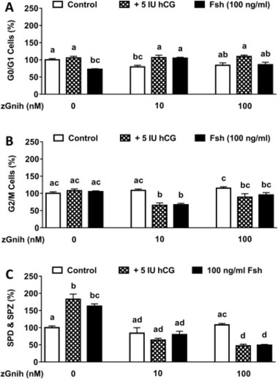Fig. 5. (A–C) Ex vivo effects of 0, 10 and 100 nM zGnih alone or in combination with 5 IU/ml hCG and 100 ng/ml (Fsh) on zebrafish spermatogenesis (G0/G1) cells (A), G2/M cells (B), spermatids (SPD) and spermatozoa (SPZ) cell populations (C). Zebrafish testes were dissociated after 7 days culture and assayed using FACScan analysis by FCM. The percentage of diploid and haploid cells were determined by BD CellQuest Pro for 0, 10, 100 nM zGnih treatments (mean ± SEM; n = 5). Counts were normalized to 100%, and treatment groups were normalized against their basal controls. Results were analyzed by ANOVA followed by Tukey's multiple comparison tests. Values with dissimilar superscripts are significantly different (P ≤ 0.05).  |