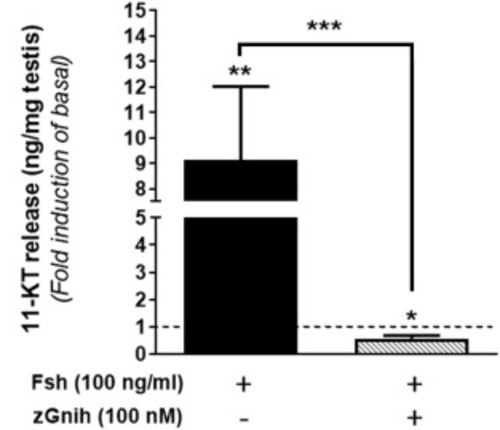 Fig. 6. Concentration of 11-KT (11-Ketotestosterone) (ng/mg of testis weight) measured in the incubation media after short-term exposure (18 h) in the presence of 100 ng/ml Fsh with or without 100 nM zGnih. Bars represent mean ± SEM (n = 8). Values were normalized with respect to weight of testis and expressed as relative fold change of the basal control shown as dotted line. Asterisks over each column represents differences with respect to basal control. Asterisks over connected line between the two treatments (black bar: 100 ng/ml Fsh; grey bar: 100 ng/ml of Fsh + 100 nM zGnih) shows significant difference between the two treatment groups as shown, using Student's T-test (*p < 0.05; **p < 0.01; ***p < 0.001).  |