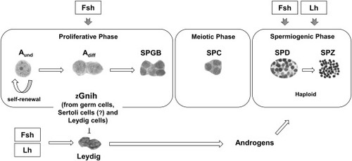 Fig. 8. A proposed model of the paracrine effects of zGnih and gonadotropins (Lh and Fsh) on zebrafish spermatogenesis. The figure illustrates the progression of spermatogenesis from type A undifferentiated spermatogonia to haploid spermatozoa cells in the presence of locally produced zGnih peptides from germ cells, Sertoli cells, and Leydig cells (Fallah et al., 2019). The diagram also illustrates the involvement of Leydig cells in the production of androgens leading to cellular differentiation, meiosis and spermiogenesis. Lh and Fsh signaling both stimulate spermatogenesis; however, they differentially regulate this process and function on different phases of spermatogenesis. zGnih is capable of inhibiting both Lh and Fsh induced-spermatogenesis by altering the number of spermatogonia cells and their proliferative activity or affecting the androgen production. Blocked lines represent inhibition. Aund: type A undifferentiated spermatogonia, Adiff: type A differentiated spermatogonia, B: type B spermatogonia, SPC: spermatocytes, SPD: spermatids, SPZ: spermatozoa.  |