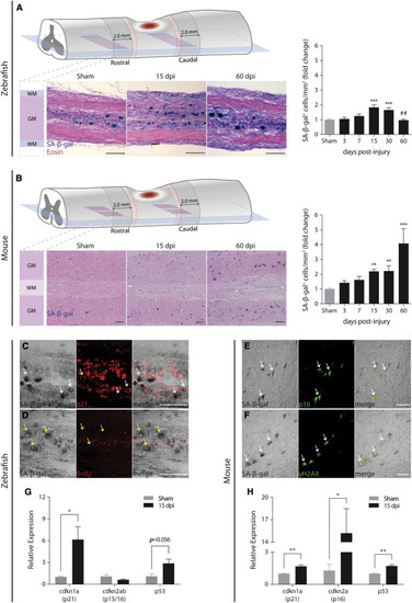 Different senescent cell dynamics are induced after spinal cord injury in zebrafish and in mice (A and B) SA-β-gal+ cells (blue) were detected and quantified in non-injured (sham) and injured zebrafish spinal cords at different time points (3, 7, 15, 30, and 60 days post-injury [dpi]). n = 5–16. Similarly, SA-β-gal+ cells were detected and quantified in mouse laminectomized (sham) and injured spinal cords at the same time points. n = 4–16. Eosin counterstaining was performed after cryosectioning. Cells were quantified at the lesion periphery along 2.0 mm in longitudinal sections spanning the ventral horn. A 0.5-mm interval (red dashed zone) was established between the lesion border and the beginning of the quantification region. SA-β-gal+ cells were only quantified in the gray matter (GM) and not in the white matter (WM). Quantifications are presented as fold change toward sham. In zebrafish, SA-β-gal+ cells reach a peak at 15 dpi (238.6 cells/mm2), a 2-fold increase compared to sham (127.2 cells/mm2). In mice, SA-β-gal+ cells display a 4-fold increase at 60 dpi (80.0 cells/mm2) toward sham (19.0 cells/mm2). Data are presented as mean ± SEM. ∗p < 0.05, ∗∗p < 0.01, ∗∗∗p < 0.001, versus sham; ##p < 0.01, 60 versus 30 dpi. Scale bars, 100 μm. (C and D) In zebrafish, SA-β-gal+ cells co-localized with the senescence biomarker p21 and were devoid of the proliferation marker BrdU. Images were taken at 15 dpi. White arrows point to representative examples of co-localization, while yellow arrows point to the absence of co-localization. Scale bars, 100 μm. (E and F) In mice, a similar co-localization was found between SA-β-gal+ cells and the senescence biomarkers p16 and γH2AX. White arrows point to representative examples of co-localization. Scale bars, 100 μm. (G and H) At 15 dpi, the expression of senescence biomarkers, namely cdkn1a (encodes for p21), cdkn2ab (encodes for p15/16 in zebrafish), cdkn2a (encodes for p16 in mice), and p53, was evaluated by qPCR. Results are presented as relative expression toward sham. Data are presented as mean ± SEM. ∗p < 0.05, ∗∗p < 0.01, versus sham. |