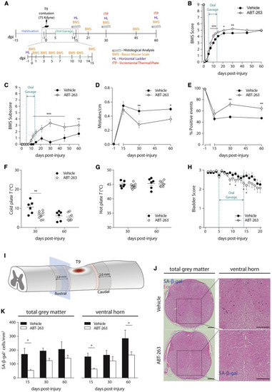 Targeting senescent cells with ABT-263 improves motor, sensory, and bladder function recovery following a spinal cord injury in mice (A) Schematic of the experimental setup. Animals were habituated to the different behavioral setups for a 15-day period, before being submitted to a moderate-to-severe (force, 75 Kdyne; displacement, 550–750 μm) T9 contusion injury. Injured animals received daily vehicle or ABT-263 via oral gavage, from 5 to 14 dpi. (B and C) Basso Mouse Scale (BMS) score and subscore were evaluated in an open field at different time-points (0, 1, 3, 5, 7, 10, 12, 15, 21, 30, 45, and 60 dpi). n = 18–19. (D and E) The locomotor performance in the horizontal ladder (HL) was assessed at −1 (control), 15, 30, and 60 dpi by quantifying the total number of mistakes per centimeter and the percentage of singular positive events (plantar step, toe step, and skip) measured and averaged across three successful trials. n = 3-6. (F and G) Thermal allodynia was tested at 30 and 60 dpi by determining the temperature at which injured mice reacted to a cold or hot stimulus. n = 6–8. (H) Bladder function was grossly evaluated by attributing a bladder score to the amount of urine collected each time a bladder was manually voided. n = 18–19. (I) SA-β-gal+ cells were quantified in a total of 10 different transversal sections (5 rostral and 5 caudal) along 2.0 mm at the lesion periphery. A 0.5-mm interval (red dashed zone) was established between the lesion and the beginning of the quantification region. (J) Eosin counterstaining was performed after cryosectioning. SA-β-gal+ cells (blue) were quantified in the total sectional gray matter and only at the ventral horn. Scale bars, 200 μm. (K) Quantifications were performed at all experimental endpoints (15, 30, and 60 dpi). At 15 dpi, ABT-263 treatment significantly decreased the number of SA-β-gal+ cells/mm2 in the total gray matter and in the ventral horn by 68.4% and 58.0%, respectively. At 60 dpi, a significant reduction (41.9%) of SA-β-gal+ cells/mm2 in ABT-263-treated animals was still observed in the ventral horn. n (15 dpi) = 3–4; n (30 dpi) = 3–4; n (60 dpi) = 2–3. Data are presented as mean ± SEM. ∗p < 0.05, ∗∗p < 0.01, ∗∗∗p < 0.001, ABT-263 versus vehicle. |