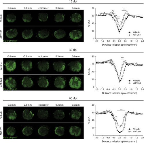 White matter sparing is increased after targeting senescent cells with ABT-263 Transversal sections at different distances from the lesion epicenter of an injured spinal cord at 15, 30 and 60 dpi, treated with vehicle or ABT-263, and stained with FluoroMyelin (green) and the corresponding quantifications. White matter sparing was assessed by normalizing the area stained with FluoroMyelin (green) to the total cross-sectional area (CSA) of spinal cord sections every 100 μm ranging from 2 mm rostral and 2 mm caudal to the lesion epicenter. Scale bars, 500 μm. n (15 dpi) = 3–4; n (30 dpi) = 3–4; n (60 dpi) = 2–3. Data are expressed as % CSA and presented as mean ± SEM. ∗p < 0.05, ∗∗p < 0.01, ∗∗∗p < 0.001, ABT-263 versus vehicle. |