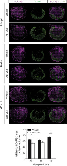 Targeting senescent cells leads to a reduction of the fibrotic scar Transversal sections at the lesion epicenter of an injured spinal cord at 15, 30, and 60 dpi treated with vehicle or ABT-263 and stained with the fibrotic scar marker PDGFRβ+ (magenta) and with the astrocytic scar marker GFAP (green). The fibrotic scar area was evaluated by normalizing the PDGFRβ+ area to the total cross-sectional area at the lesion epicenter. GFAP+ tissue surrounds the fibrotic core. Scale bars, 200 μm. n (15 dpi) = 3–4; n (30 dpi) = 3–4; n (60 dpi) = 2–3. The lower panel shows the percentage of fibrotic tissue in the injury core as quantified at 15, 30 and 60 dpi. Data are presented as mean ± SEM. ∗p < 0.05, ∗∗p < 0.01, ABT-263 versus vehicle. |