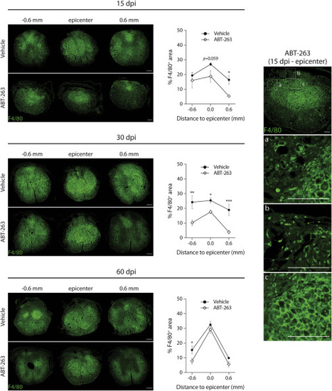 ABT-263 treatment decreases the number of macrophages at the injury site Transversal sections at the lesion epicenter of an injured spinal cord at 15, 30 and 60 dpi treated with vehicle or ABT-263 and stained with the pan-macrophage marker F4/80 (green). Scale bars, 200 μm. The area of F4/80+ tissue was measured at the lesion epicenter and 600 μm rostrally and caudally from the epicenter. The panel on the right displays zoomed images of three different zones (a–c) of an ABT-263-treated spinal cord transversal section stained with F4/80 at 15 dpi. Macrophages form a network inside the central lesion core, but they can be individually distinguished outside of it. Scale bars, 100 μm. Measurements are expressed as a percentage of the total cross-sectional area. n (15 dpi) = 3–4; n (30 dpi) = 3–4; n (60 dpi) = 2–3. Data are presented as mean ± SEM. ∗p < 0.05, ∗∗p < 0.01, ∗∗∗p < 0.001, ABT-263 versus vehicle. |
