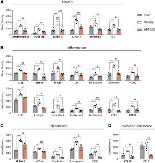 Targeting SCs with ABT-263 reduces key pro-inflammatory and pro-fibrotic factors that are induced upon spinal cord injury (A–D) Cytokine and chemokine expression was measured in spinal cord homogenates from laminectomized (sham), vehicle-, and ABT-263-treated animals at 15 dpi. From a total of 111 factors analyzed, 26 were both upregulated upon injury (sham versus vehicle) and significantly decreased after ABT-263 treatment (vehicle versus ABT-263). Factors were divided in different groups regarding their role in (A) fibrosis, (B) inflammation, (C) cell adhesion, or (D) paracrine senescence. Some of the identified factors, displayed in bold, have been previously described as SASP factors. Data are expressed as mean density and presented as mean ± SEM. ∗p < 0.05, ∗∗p < 0.01, ∗∗∗p < 0.001, vehicle versus sham; #p < 0.05, ##p < 0.01, ###p < 0.001, ABT-263 versus vehicle. |