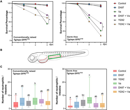 Survival and neutrophil counts in conventionally raised (CONV-R) and germ-free |