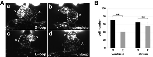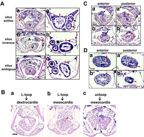 Situs solitus, situs inversus, and situs ambiguus in zebrafish visceral organ development (A) Whole mount double in situ hybridization reveals laterality of the developing liver (arrow) using a foxa3 RNA probe (purple) in the dorsal view of control (a) and experimental embryos (b–d) and the cardiac looping using the myocardial marker myl7 (brown) in the ventral view of control (a’) and experimental embryos (b’–d’). A, atrium; V, ventricle. Scale bars, 150 µm. (B) Ventral views of 6 dpf larvae stained with Streptavidin-Cy3 (Strep-Cy3) to visualize situs solitus (a), situs inversus (b), and situs ambiguus (c) of the heart (black arrow), liver (white arrow) and gut (yellow arrow). Scale bar, 150 µm. |