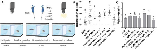 Co-administration of Tetrahydrocannabinol (THC) and GABAA receptor antagonist pentylenetetrazol (PTZ) affects the THC-induced behavioral stereotypy in adult zebrafish. ( PHENOTYPE: