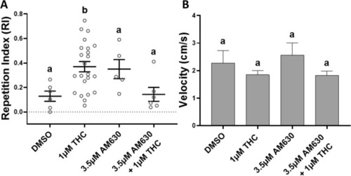 Co-administration of Tetrahydrocannabinol (THC) and the inverse CB2R agonist AM630 significantly reduced the THC-induced behavioral stereotypy in adult zebrafish. (A) At 3.5 μM AM630 with 1 μM THC the THC-induced Repetition Index (RI), calculated as a mean ± SEM, was not statistically different from the controls (DMSO) (ns p > 0.9999). (B) AM630 and THC co-administration did not affect the swimming velocity during exposure. Controls (DMSO 1%, n = 6), 1 μM THC (n = 23), 3.5 μM AM630 (n = 5) and 3.5 μM AM630 + 1 μM THC (n = 6). Values without a letter in common are statistically different to the control condition (p < 0.05, Kruskal–Wallis and Dunn's multiple comparisons test). |